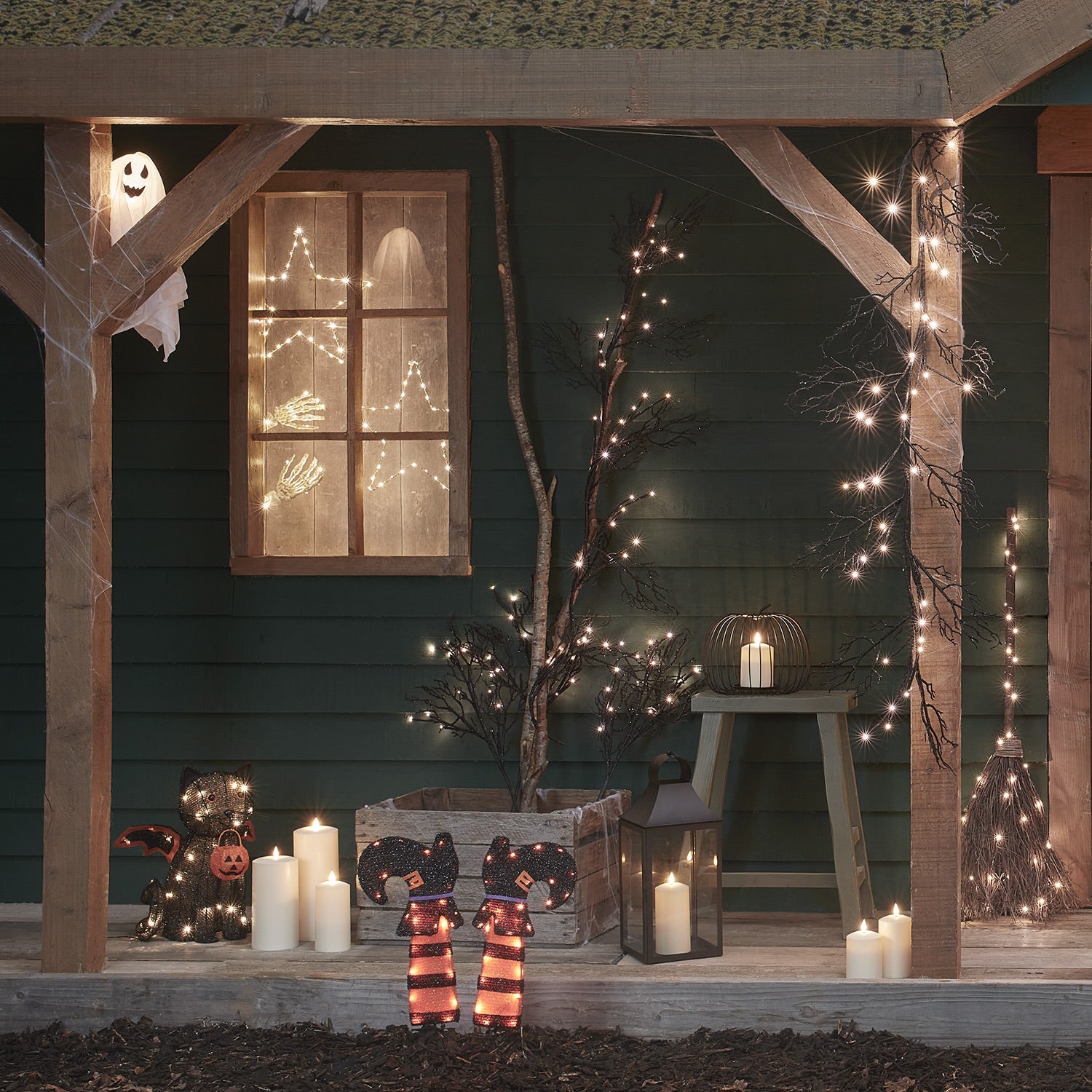 Add a wicked glow to your garden this Halloween with our witches leg stake lights. At 45cm in height these spooky stakes are perfect for styling in plant pots or in your front garden for trick or treaters and all passers-by to see. || Made from a glittery black and orange fabric and illuminated by 56 orange micro LEDs, they’ll light up your garden with a ghoulish glow for the ultimate eerie ambience. To use, simply attach your stakes and pop 3 x AA batteries into the battery box, choosing the optional 6 hour timer function for an automatic shine at the same time each night.